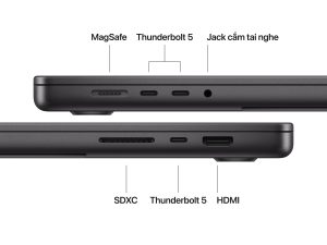 – 3 cổng Thunderbolt 5/ USB 4, 1 cổng HDMI, 1 jack tai nghe 3.5mm, 1 Khe thẻ nhớ SDXC